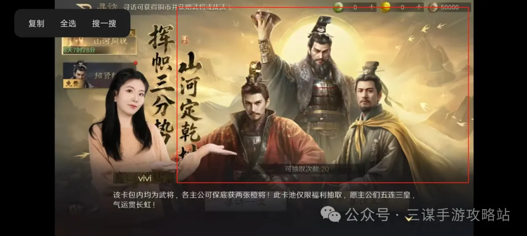 免费20抽的活动卡包,保底两张橙将。