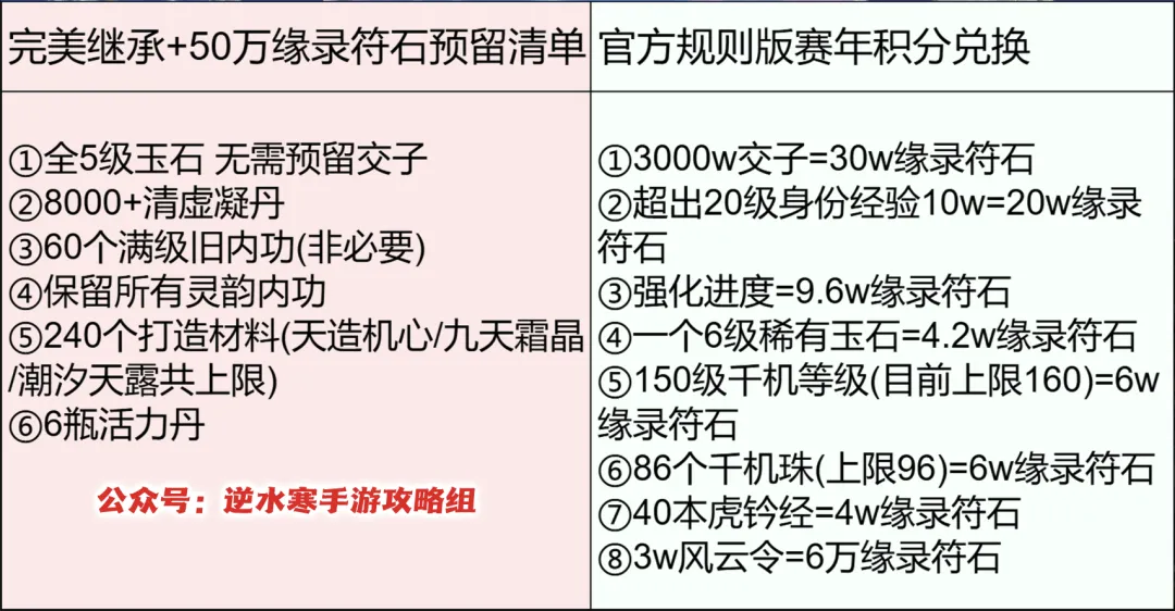 ①最少预留8000个清虚凝丹。新内功材料玄通凝丹兑换无上限,前4000个按照2:1的比例兑换,超出部分按照4:1的比例兑换。(新赛年初期很缺内功狗粮,个人建议不要浪费太多去赌灵韵)