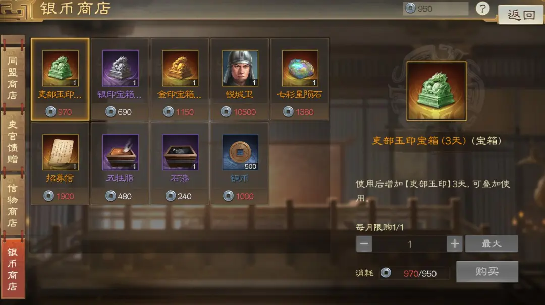 在赛季中后期,建议目前可以把资源换铜钱的能买多少就买多少。每周把同盟商店需要的战功打完之后就可以不用拼命刷战功了,把资源换铜币,然后攒紫卡,为下赛季开荒做准备了。