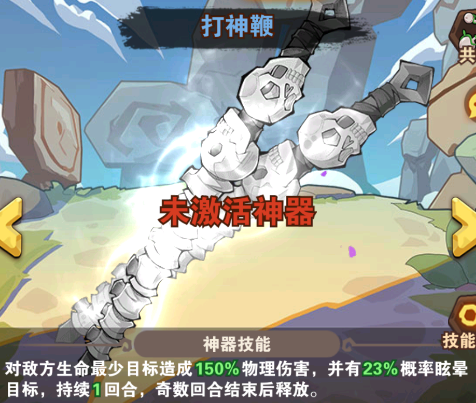 打神鞭:对敌方生命最少目标造成150%物理伤害,并有23%概率眩晕目标,持续1回合,奇数回合结束后释放。