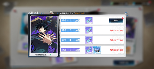 3、随着你的战力不断提升,在式神副本中挑战更高级的难度副本,可以获得更高品质的式神碎片,每天挑战的次数记得一定要完成,产出的材料性价比很高,就算花费钻石完成也是必须的。