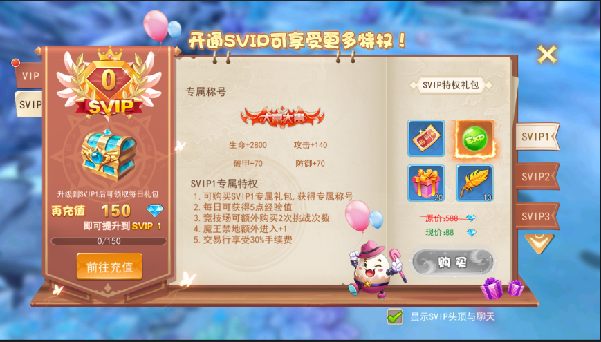 u vip分为免费vip和svip,免费vip通过玩家升级获取经验并发放道具和称号激活卡,svip需要玩家充值获得经验升级