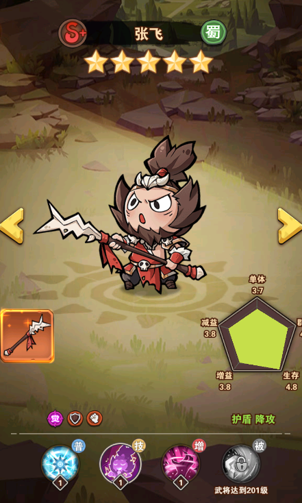 技能:全体恢复生命并提升防御(恢复生命石根据自身攻击力结算的,所以攻击力叠高),