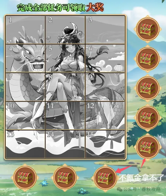 4、【续缕延年】完成拼图任务得天师符和八宝香粽,但是有一点,任务15是需要氪金100才能完成的,所以与15任务关联的奖励拿不了。这里经计算,白嫖玩家可获得23个天师符,氪金玩家可获得32个天师符+2个八宝香粽。